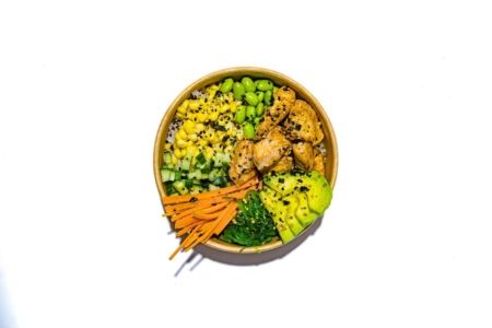 Poke bowl gegrilde kip, sojabonen, mais, komkommer, wortel, avocado en wakame (7 componenten)